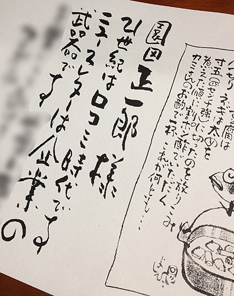 昨日某新年会で、筆師のUさんという方にお会いしました。U氏のことは実はそれまで存じ上げてなかったのですが、U氏の描いた筆文字や絵はよくお見かけしていて、“この絵を描いていたのがUさんだったんだ!”と思った次第です。